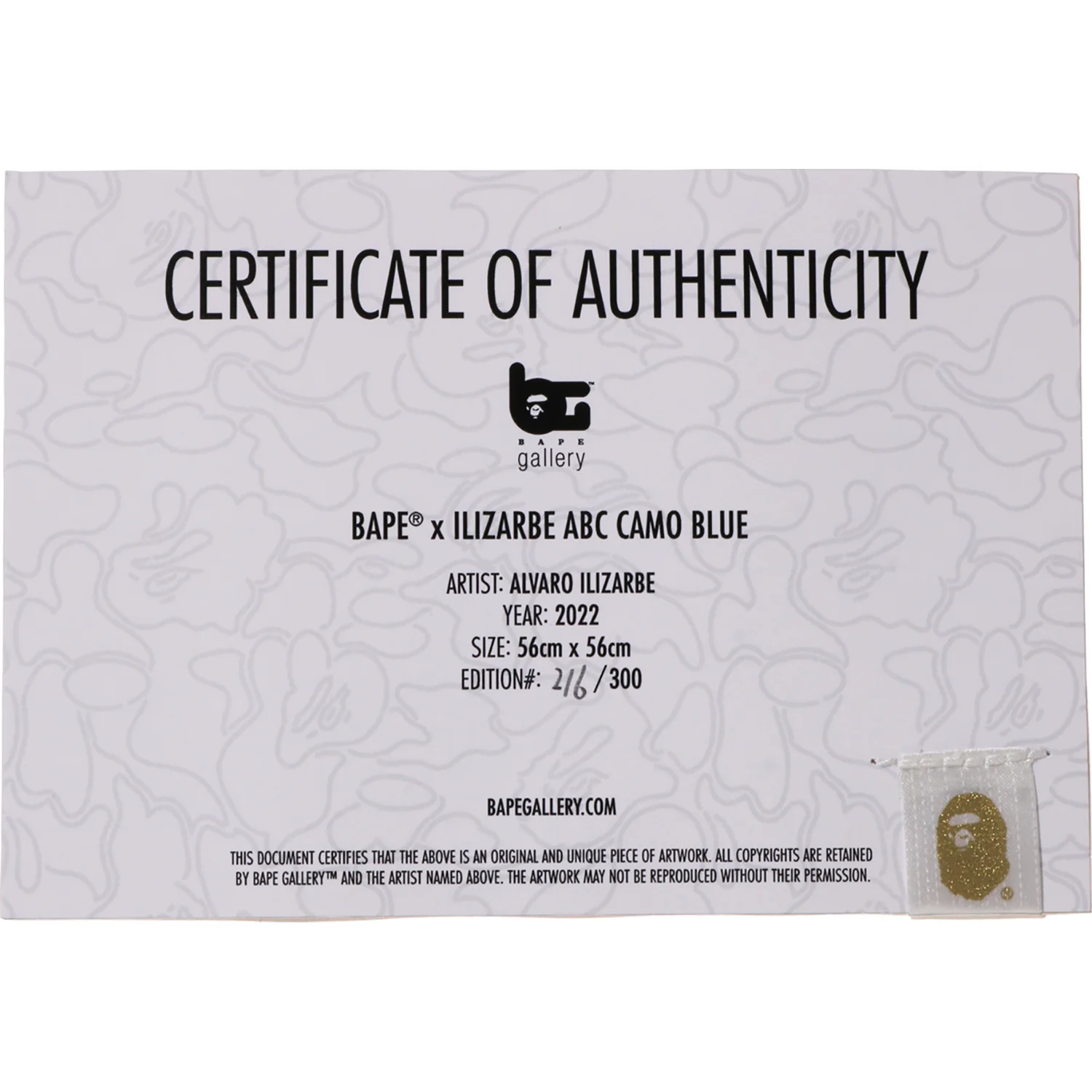 Alvaro Ilizarbe’s BAPEA X ILIZARBE ABC CAMO BLUE blends art and design with a unique camouflage pattern that hides an encrypted message. Inspired by pre-Columbian linework and modern graphics, this piece transforms the iconic Ape Head logo into a coded visual experience. Printed on ivory white matte paper, it measures 56cm by 56cm and weighs 245g, making it a striking addition to any space.