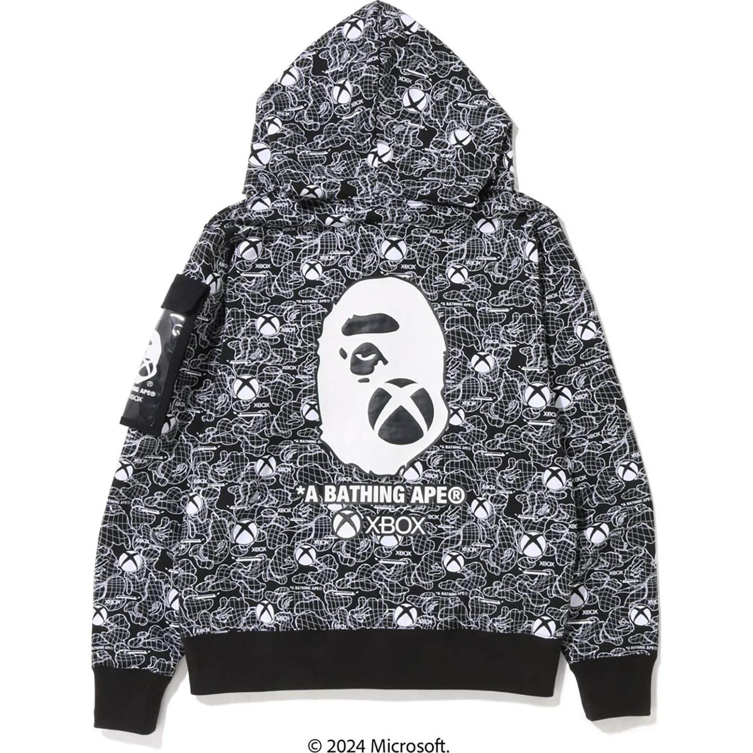 This BAPE x XBOX camo hoodie features a cotton fleece zip-up design with a unique layered APE HEAD and XBOX logo print. It includes a removable smartphone pocket, a silicone logo tag, and a muff pocket for convenience. The regular fit offers comfortable wear, blending style with practical details in this special collaboration with XBOX.
