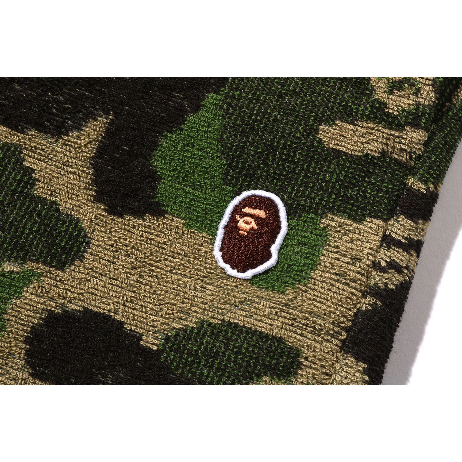 BAPE MENS COTTON ABC CAMO PILE ONE POINT SWEAT SHORTS provide exceptional comfort while featuring the unique ABC CAMO pattern. Made from soft, plush terry fabric, they include an APE HEAD patch on the left thigh for a standout detail. The relaxed waistband comes with a drawstring, allowing you to adjust the fit for maximum comfort.