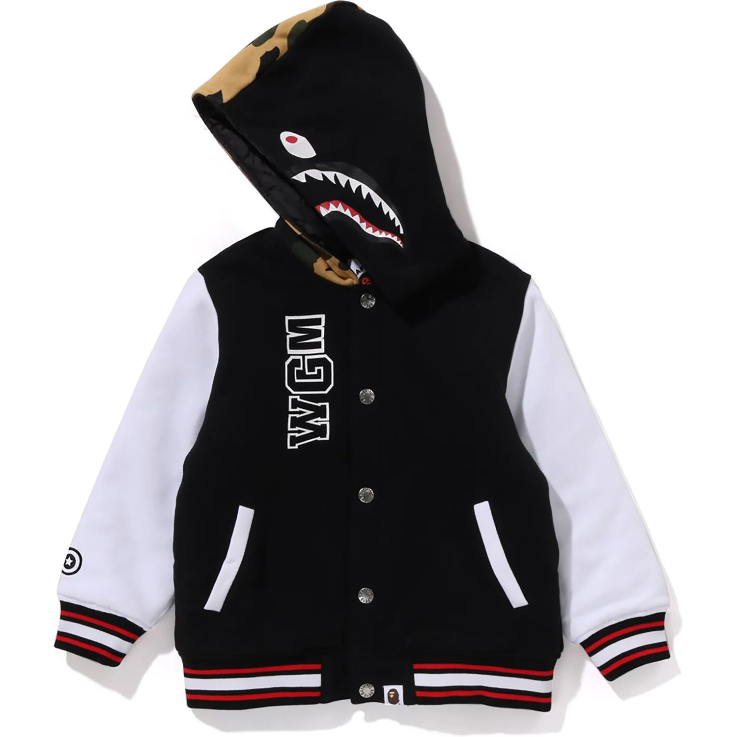 This kids varsity jacket features a cozy cotton brushed lining and a MILO SHARK motif with 1ST CAMO design. It has a regular fit, long sleeves, snap buttons, pockets, and an APE HEAD label for added style and comfort.